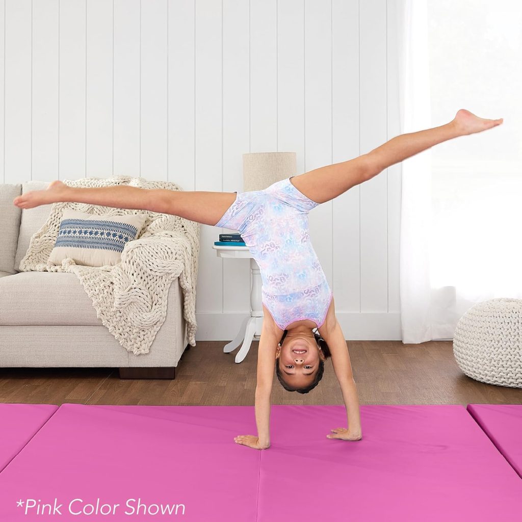 If you’re looking for a mat that comes in more than one color, check this one out! It’s also a longer mat, 10’x4′, for larger matted areas or gymnasts who want to be able to perform more skills. It is also foldable and features a carrying handle. All of the colors appear to be on sale, so choose your favorite!
